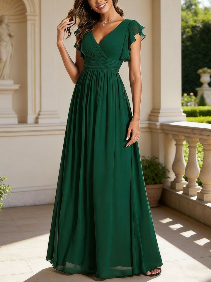 Robe de Mère de la Mariée Coupe A-Line/Princess, Col en V, Manches Courtes, Longueur Cheville, avec Poches et Volants