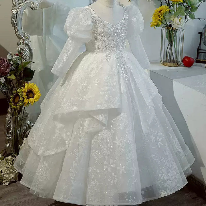 Robe de Bal à Manches Longues en Dentelle avec Appliques en Cristal pour Fille