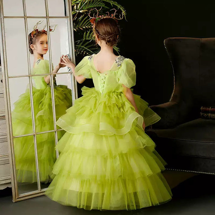 MON11112811 Robe de Soirée à Manches Courtes pour Fille, à Plusieurs Couches, avec Appliques