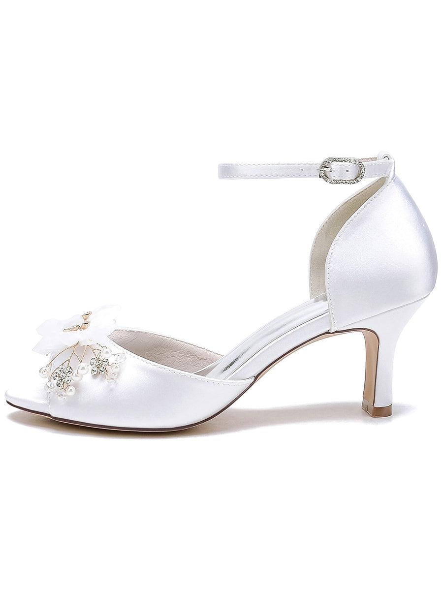 Chaussures de Mariage pour Femmes en Satin de Soie avec Fleur en Cristal et Boucle à Bout Ouvert