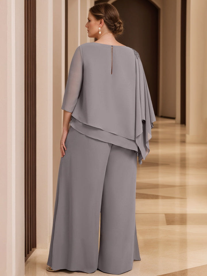 MON2311931 Robe de Mère de la Mariée Grande Taille en Mousseline de Soie 2 Pièces à Manches 3/4 et Longueur Au Sol avec Perles