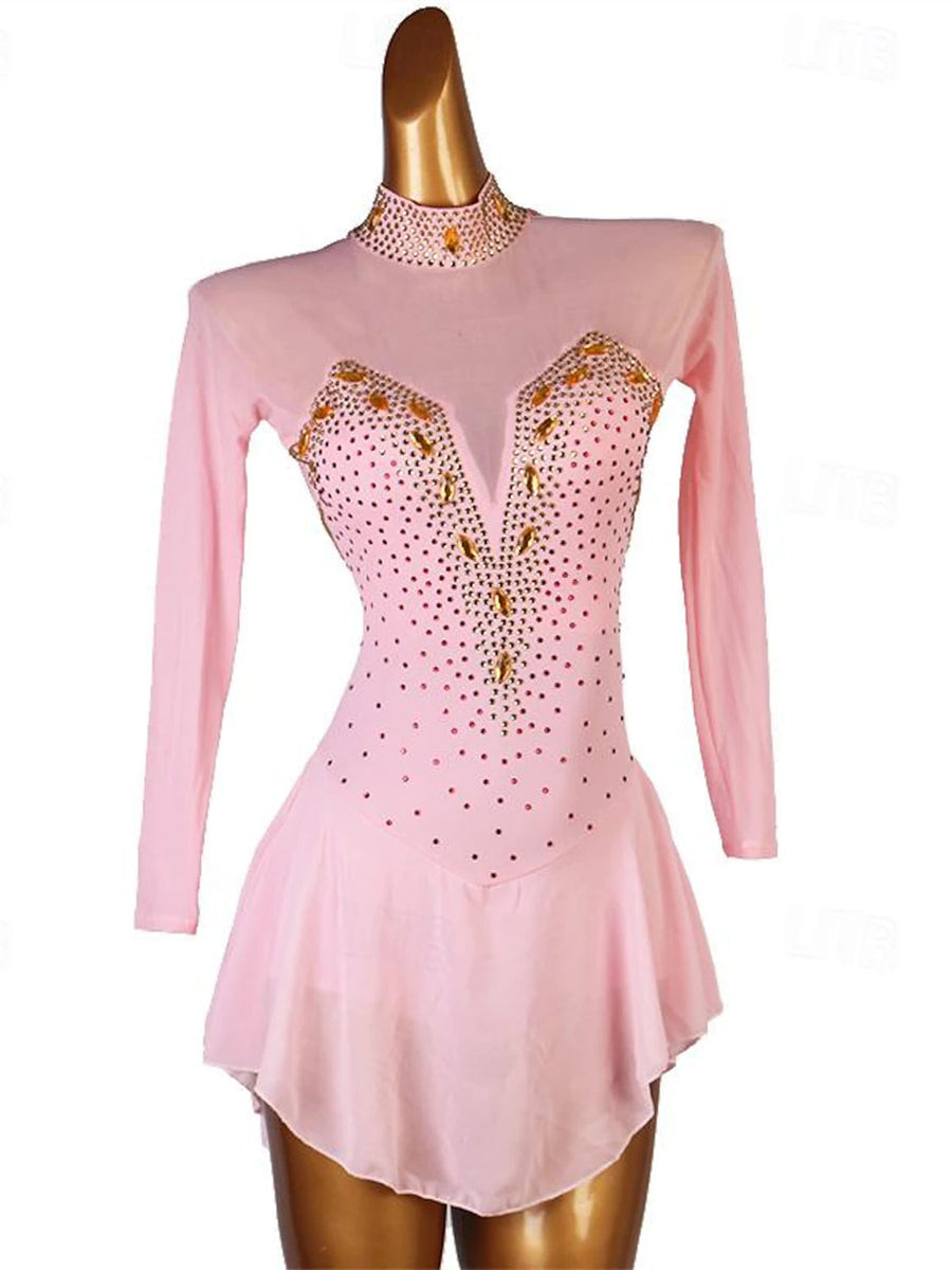 MON4041651W Robe De Danse Latine À Manches Longues Et Strass Pour Femme, Tenue De Performance, En Spandex Et Tulle