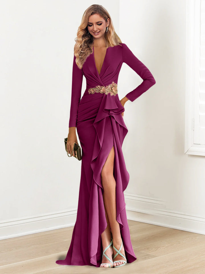 MON2311444 Robe de Mère de la Mariée Fourreau/Colonne à Col en V et Manches Longues, Longueur Au Sol, avec Perles en Crêpe