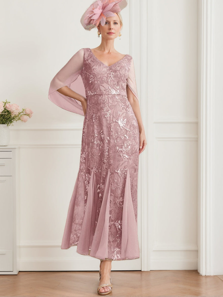 MON2311939 Robe de Mère de la Mariée Coupe A-Line/Princess à Col en V et Manches Mi-Longues avec Couleur Unie et Dentelle