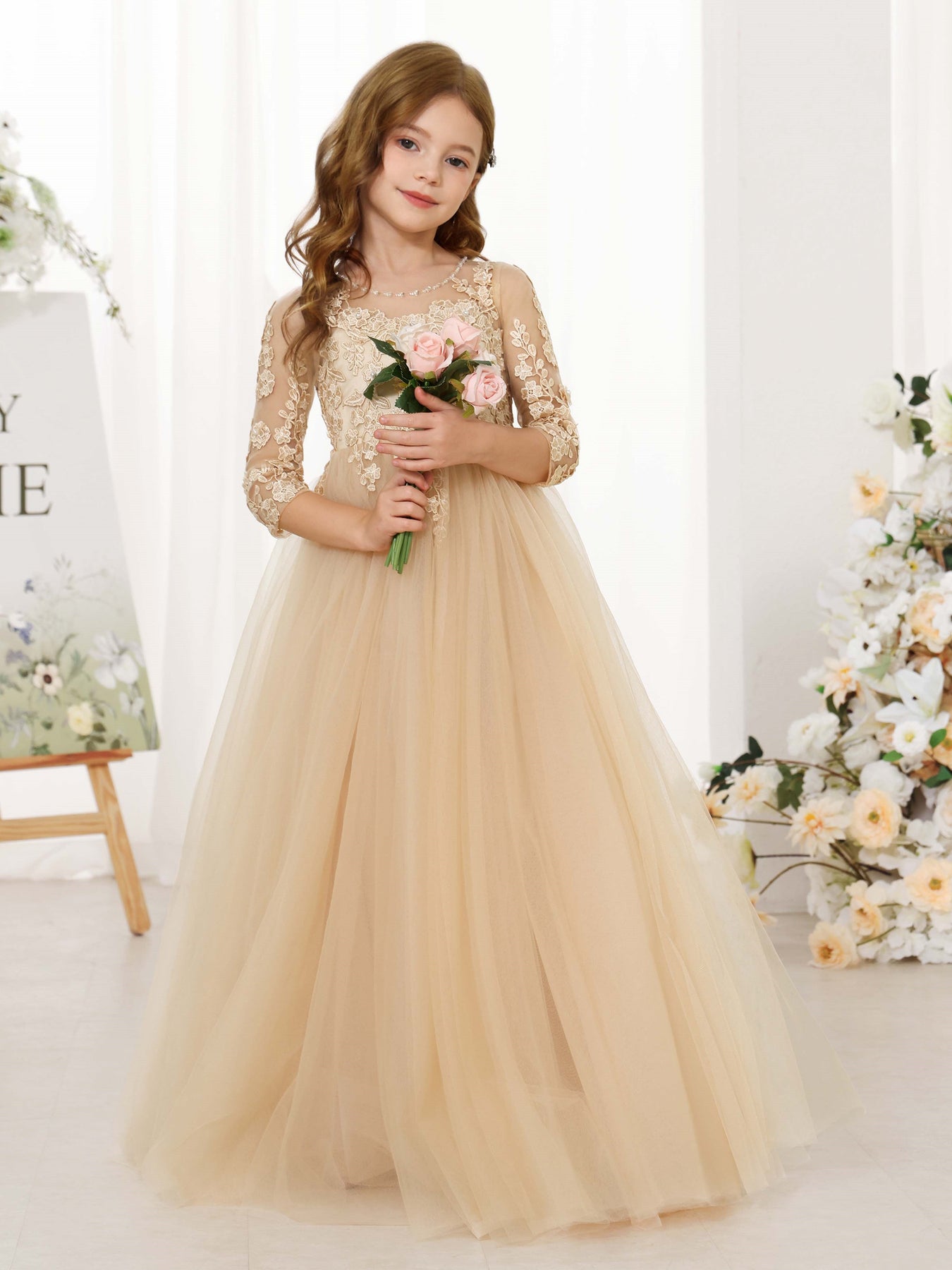 MON11112419 Robe de Demoiselle D'Honneur en Dentelle à Manches 3/4, Col Rond, Longueur Au Sol, Coupe A-Line/Princess