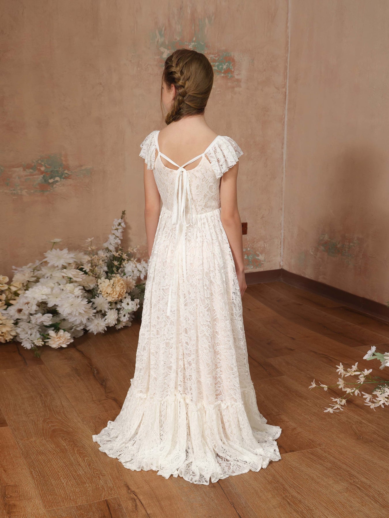 MON11112440 Robe de Demoiselle D'Honneur en Dentelle à Manches Courtes et Col Carré, Coupe A-Line/Princess, Longueur Au Sol