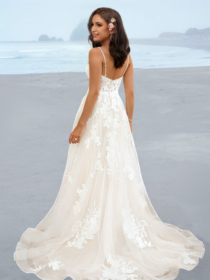 MON141226 Robe de Mariée Trapèze/Princesse à Bretelles Spaghetti et Longueur Au Sol avec Appliques