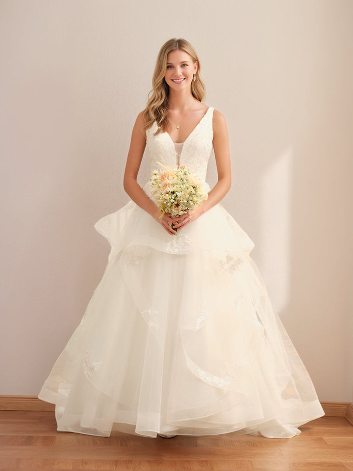 MON141473 Robe de Mariée en Tulle Ivoire Sans Manches à Col en V avec Appliques en Dentelle