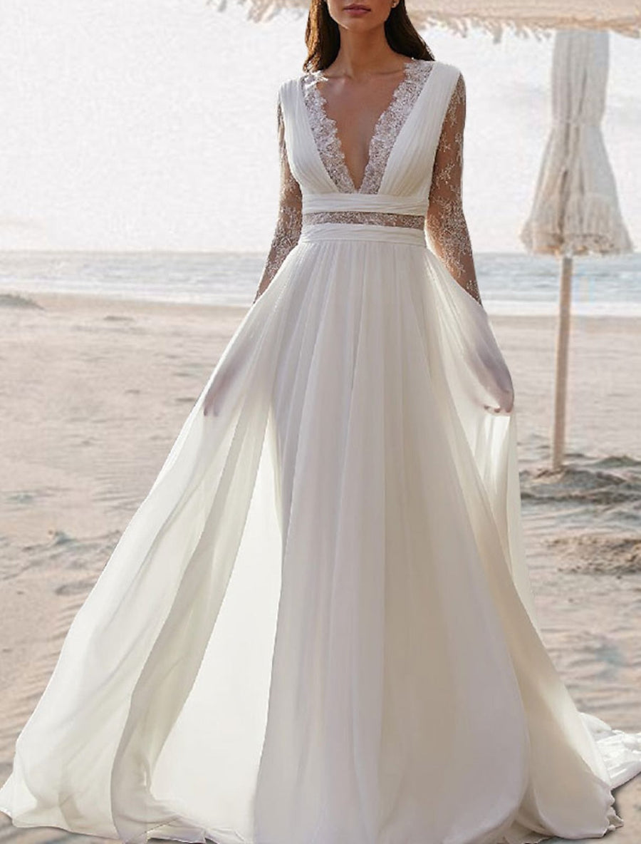 MON141173 Robe de Mariée en Dentelle Coupe A-Line/Princesse, Col en V, Longueur Au Sol