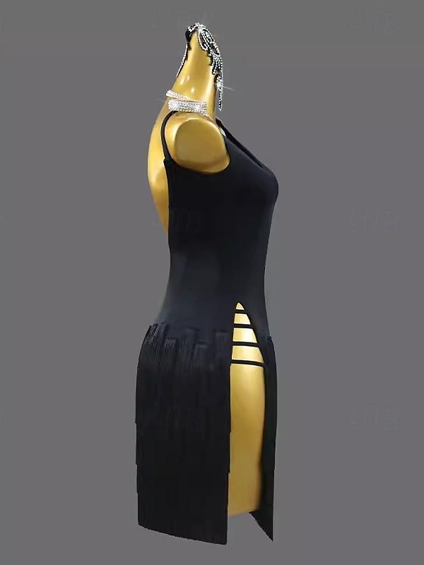 MON4041752W Robe de Danse Latine Salsa Chinlon à Pompons de Couleur Pure Sans Manches avec Épissure pour Femme