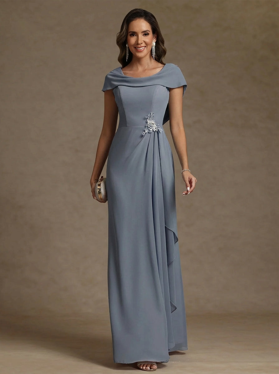 MON2312666 Robe mère de la mariée fourreau mousseline, col drapé, sans manches, longueur sol, strass et volants