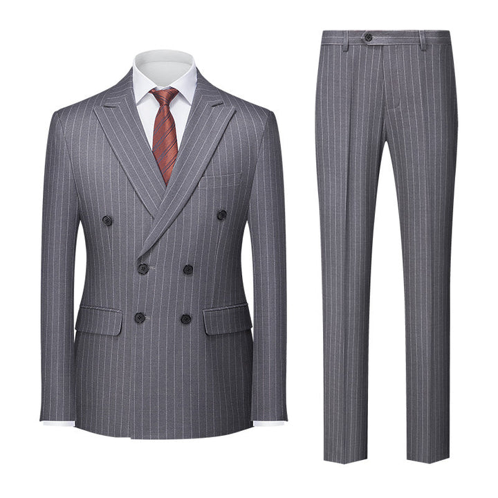 MON3120639 Costumes de Mariage 2 Pièces à Rayures pour Hommes, Coupe Ajustée, Croisé, Six Boutons, Bleu Kaki, Bordeaux, Gris, Noir