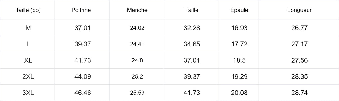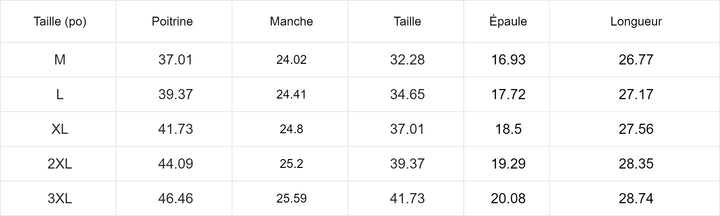 | 2XL | 44.09 | 25.20 | 39.37 | 19.29 | 28.35 |